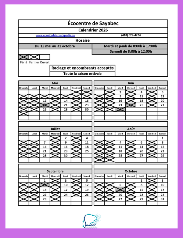 - Calendrier Écocentre de Sayabec